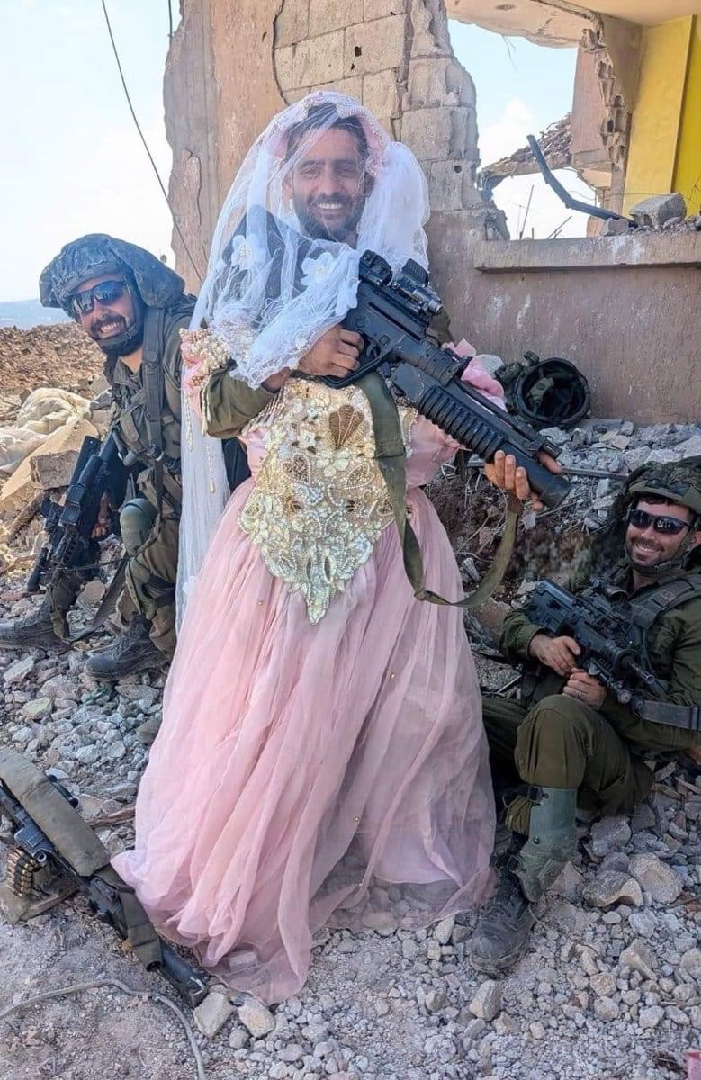 Die „netten“ Männer auf dem Foto haben gerade das Wohnhaus in die Luft gesprengt. Und jetzt – wie lustig – trägt einer von ihnen das Hochzeitskleid der Frau, die jetzt unter den Trümmern begraben liegt oder auf der Flucht vor dem israelischen Militär ist. Wie nennt man solche Typen wie auf dem Foto? Menschliche Tiere. Nein, Tiere tun so etwas nicht. Monster – ja, vielleicht Monster, so etwas wie Massenmörder. Vielleicht so psychopathisch wie der Serienmörder Jeffrey Dahmer. Nein, schlimmer. Eher wie die SS-Schergen, die jüdische Frauen, Kinder und Männer in die Gaskammern steckten und anschließend in den Hochöfen verbrannten. Ja, das wäre ähnlich. Irgendwann werden Psychologen das Verhalten analysieren, man wird Denkmäler für die Ermordeten errichten, und der Zionismus wird geächtet werden wie der Faschismus. Dann, wenn es zu spät ist, wenn der Völkermord geschehen ist, wenn die Menschen tot sind, wird die nächste Generation vielleicht wieder sagen: „Nie wieder“, und das „Nie wieder“ wird vielleicht, wie jetzt, in einem anderen Gewand, mit einer anderen Maske daherkommen.